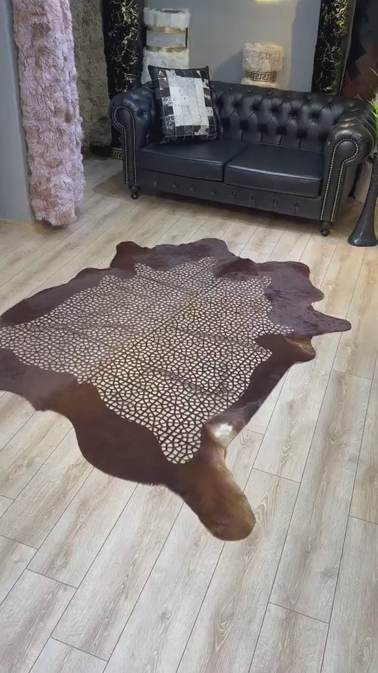 Special Laser Embroidered Calfskin Rug, Brown Natural Cow Hide Decor Rug