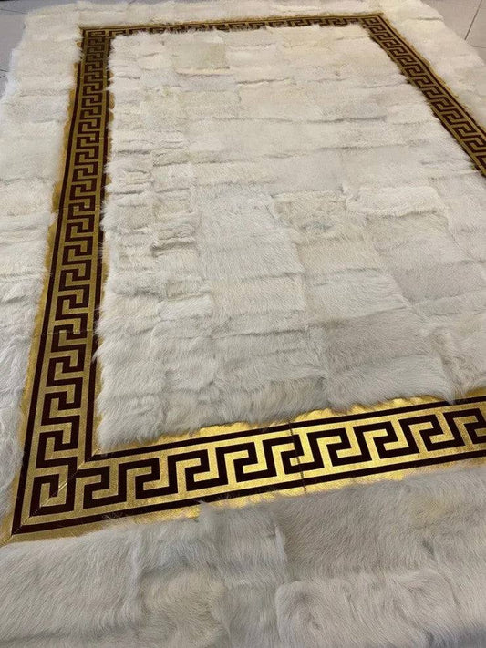 Luxury Black White Natural Sheepskin Area Rug, Gold Greek Key Handmade Rug