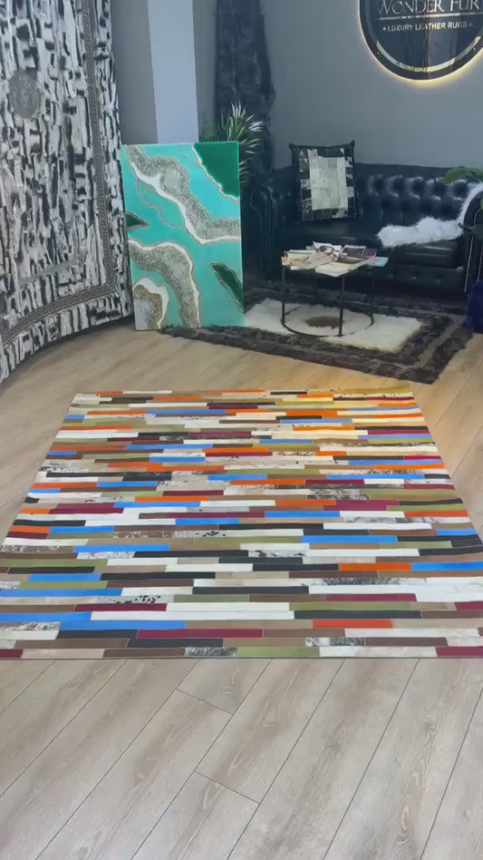 Colorful Natural Cowhide Patchwork Rug, Unique Multicolor Handmade Cow Skin Rug, Non Slip Rug