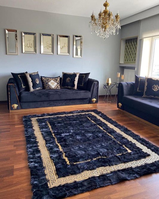 Unique Handmade Black Gold Real Sheepskin Soft Fluffy Living Room Rug