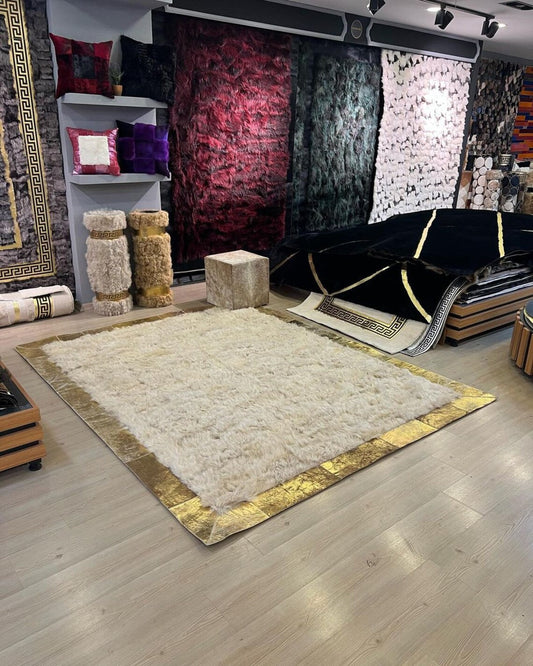 100% Natural Handmade Sheepskin White And Gold Bedroom Rug