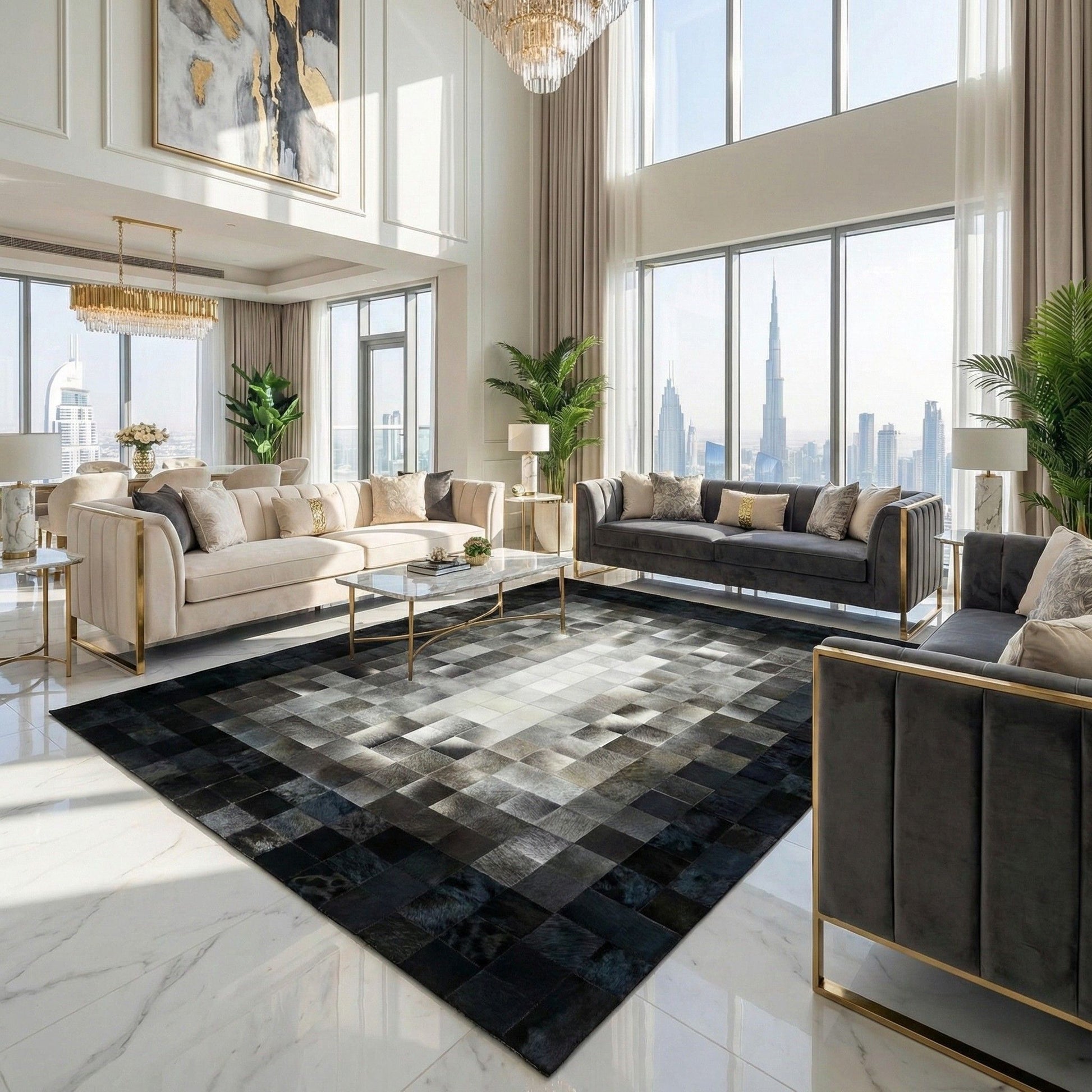 Add sophistication to your space with our Black and Gray 10x8 Handmade Genuine Cowhide Area Rug. Crafted from natural leather, this non-slip rug offers both style and durability. Elevate your decor with this exquisite statement piece.