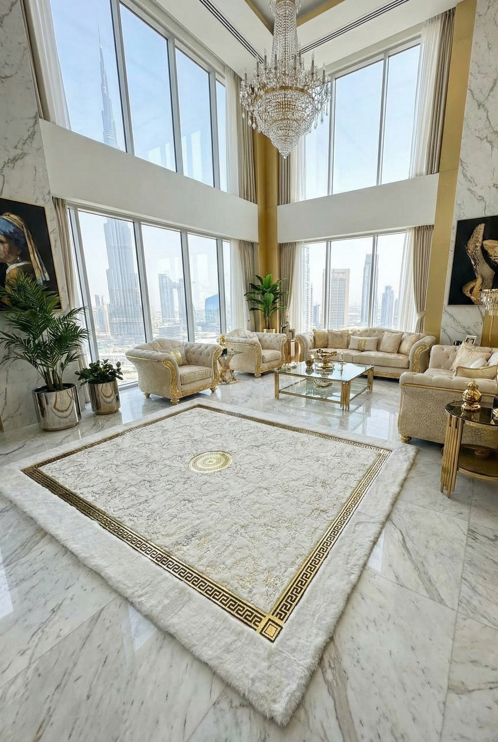 White and Gold Faux Fur Round Rug | Luxurious Soft Rug