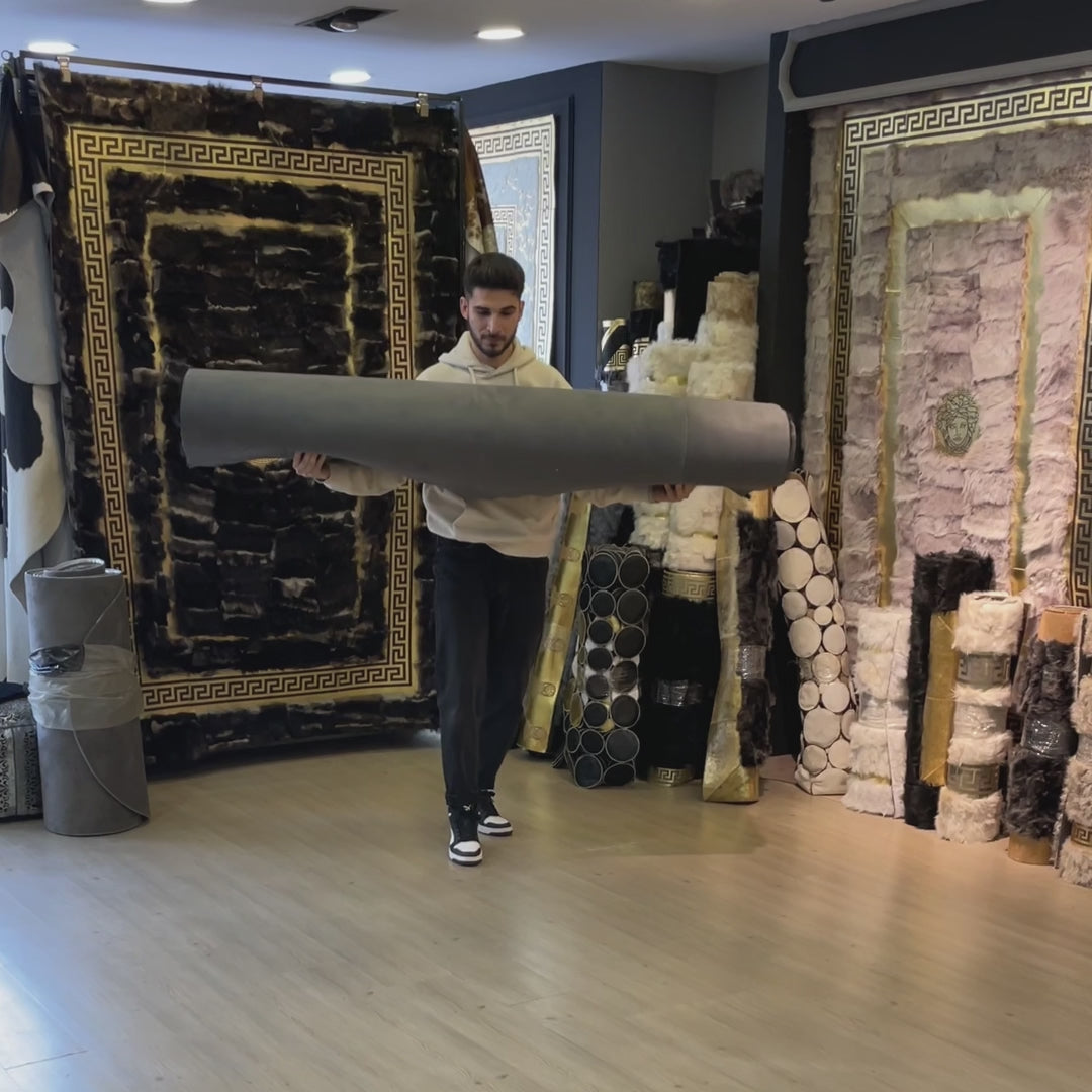 Sink into quiet luxury. This genuine black sheepskin rug, framed with a refined gold Greek key border, brings warmth, depth, and effortless elegance to any living space. Custom-made to fit your home perfectly.