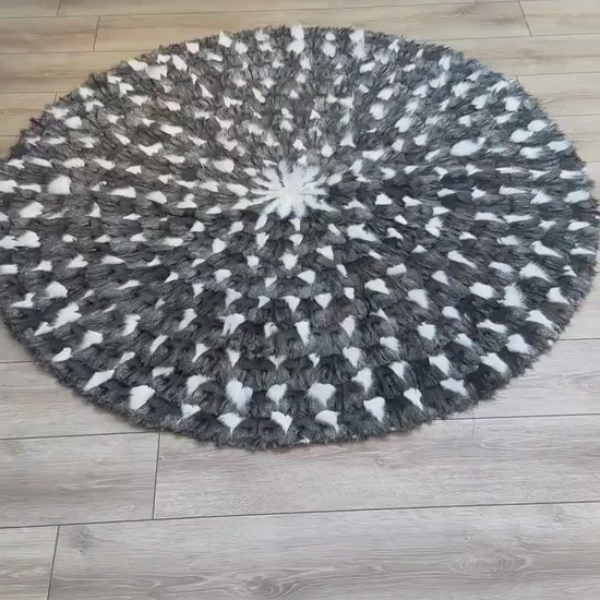 Gray White Round Shaggy Fox Fur Rug, Luxury Handamde Natural Carpet