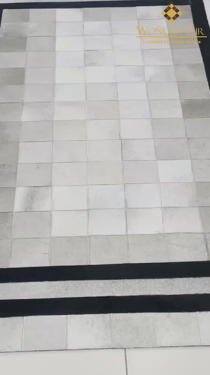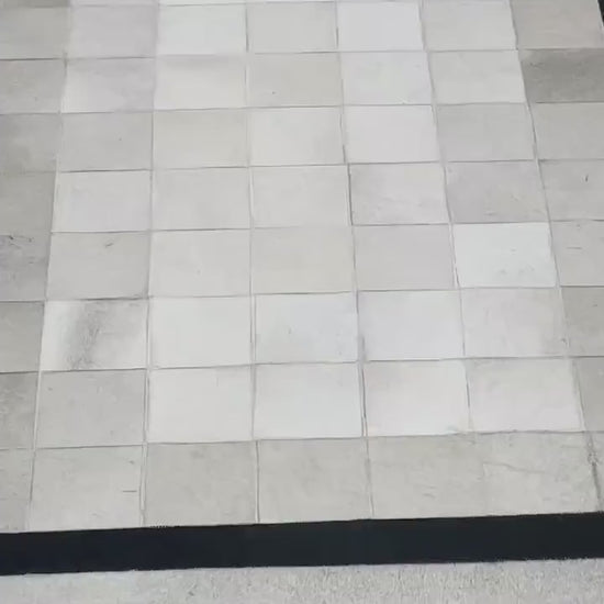 White Cowhide Patchwork Rug with Black Borders, Handmade Natural Area Rug